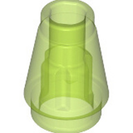 Český název dílku: kostka (kostička) kužel 1x1 s drážkou nahoře, průhledná světle zelená