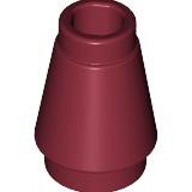 Český název dílku: kostka (kostička) kužel 1x1 s drážkou nahoře, tmavě červená