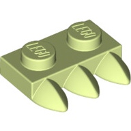 Český název dílku: destička 1x2 se třemi zuby (drápy) vodorovně, žluto zelená